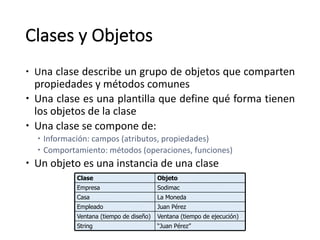 Este documento describe los conceptos básicos de la programación orientada a objetos. Explica que una clase define las propiedades y métodos comunes de un grupo de objetos, y que una clase contiene atributos (datos) y métodos (comportamientos). También describe cómo se implementan las clases, incluyendo la definición de atributos, métodos, constructores y el uso de la palabra reservada this.