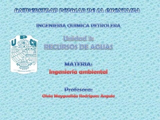 Este documento describe los recursos hidráulicos de México y los principales problemas de contaminación del agua. Explica que los recursos incluyen ríos, lagos y aguas subterráneas, las cuales abastecen a la población, la agricultura e industria. Sin embargo, muchas de estas aguas están contaminadas debido a la descarga de residuos domésticos, industriales y agrícolas. El documento también analiza los diferentes tipos y orígenes de la contaminación del agua en el país.