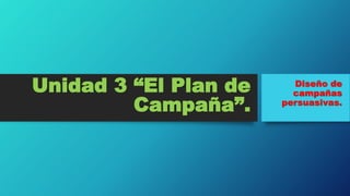 Este documento describe las etapas para diseñar una campaña de marketing persuasiva. Primero, se identifican las variables clave a analizar. Luego, se obtienen datos primarios y secundarios realizando entrevistas y búsquedas de información. Posteriormente, se realiza un diagnóstico para identificar fortalezas, debilidades, oportunidades y amenazas. Sobre esta base, se establecen objetivos cuantitativos y cualitativos y una estrategia de marketing que incluye el posicionamiento, producto, precio, plaza y prom