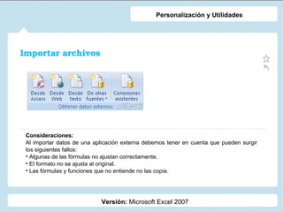 El documento proporciona instrucciones sobre cómo importar archivos, aplicar filtros y calcular subtotales en Microsoft Excel. Explica cómo importar datos desde otras aplicaciones y tener en cuenta posibles errores. Luego describe cómo usar filtros para encontrar y organizar información de manera más eficiente, incluidos filtros automáticos y personalizados. También explica cómo calcular subtotales automáticamente y crear informes resumidos usando subtotales anidados y ocultando detalles.