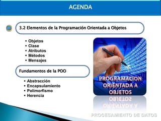 El documento presenta los conceptos básicos de la programación orientada a objetos. Explica que un objeto tiene atributos que representan su estado y métodos que definen su comportamiento. Una clase describe un conjunto de objetos con los mismos atributos y métodos. La programación orientada a objetos se basa en conceptos como abstracción, encapsulamiento, herencia y polimorfismo.