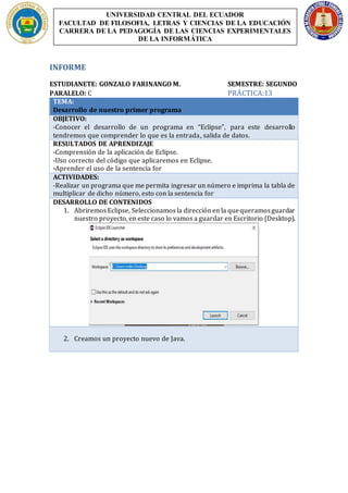 El documento describe un informe de una práctica de programación en Eclipse. El objetivo era desarrollar el primer programa usando Eclipse para comprender la entrada y salida de datos. Se aprendió a usar la sentencia for para crear un programa que permite ingresar un número y luego imprime su tabla de multiplicar. El desarrollo incluyó abrir Eclipse, crear un proyecto Java, agregar una clase principal, y usar un ciclo for junto con System.out.println para ingresar un número y mostrar su tabla de multiplicar.