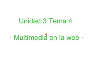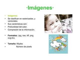 Este documento trata sobre multimedia en la web. Explica que las imágenes se clasifican en rasterizadas y vectoriales, y cubre sus formatos y tamaños comunes. También cubre la edición de imágenes, audio y video, incluyendo sus formatos, parámetros y herramientas de edición como The Gimp y Audacity. Además, explica conceptos como streaming y las plataformas populares para compartir videos como YouTube y presentaciones como SlideShare.