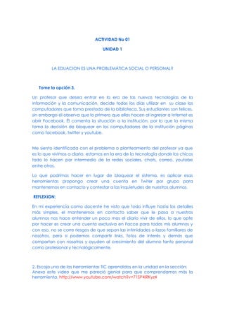 El documento describe cómo un profesor que usa computadores de la biblioteca en su clase nota que los estudiantes siempre abren Facebook en lugar de hacer sus tareas. La escuela decide bloquear páginas como Facebook y YouTube. El autor concuerda con el problema del profesor y sugiere crear una cuenta de Twitter del grupo para mantenerse en contacto con los estudiantes en lugar de bloquear el sistema.