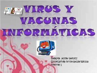 El documento habla sobre las enfermedades de los computadores, conocidas como virus informáticos. Explica que los virus actúan como malestares en el computador y que se crearon antivirus como "vacunas" para curar al computador cuando se enferma. También describe algunos tipos de virus y cómo afectan el funcionamiento del computador, además de mencionar que los antivirus sirven como herramientas preventivas para detectar cualquier virus y reportar la situación.