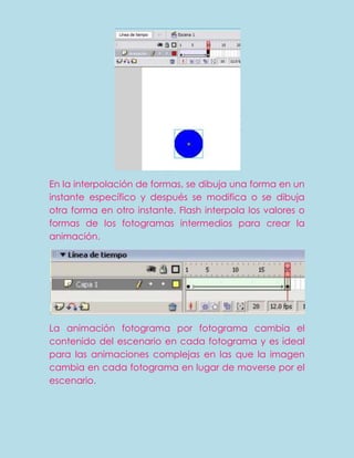 Este documento describe diferentes técnicas de animación en Flash, incluyendo: (1) la interpolación de movimiento y formas para crear animaciones suaves, (2) la animación fotograma por fotograma para animaciones complejas, y (3) las herramientas de dibujo como el pincel, lápiz y formas para crear y manipular gráficos.