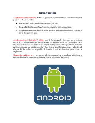 El documento presenta información sobre la administración de memoria, dispositivos de entrada y salida, y sistemas de archivos. Cubre temas como la jerarquía de memoria, algoritmos de reemplazo de páginas como FIFO y LRU, e independencia de dispositivos. También describe componentes del administrador de E/S como controladores de dispositivos y principios como manejo de interrupciones. Finalmente, explica la diferencia entre archivos físicos y lógicos y representa la jerarquía de directorios de un sistema de archivos.