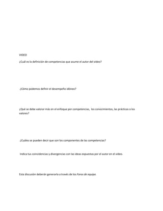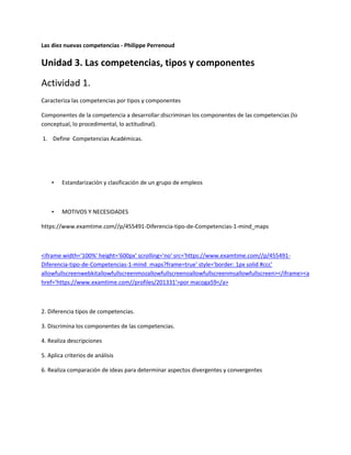 El documento describe los componentes de las competencias y cómo discriminarlos. Identifica cuatro componentes clave de las competencias: 1) lo conceptual, 2) lo procedimental, 3) lo actitudinal, y 4) la habilidad de aplicar criterios de análisis y realizar comparaciones para determinar aspectos convergentes y divergentes. El documento también incluye enlaces a recursos adicionales sobre tipos de competencias y su definición.