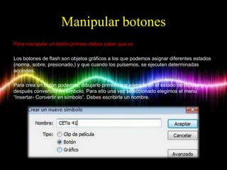 Los botones de Flash son objetos gráficos que pueden tener diferentes estados como normal, sobre y presionado. Para crear un botón, se dibuja primero y se convierte en símbolo con diferentes estados como reposo, sobre, presionado y zona activa. Se pueden agregar efectos a cada estado cambiando el color o agregando capas. También se pueden asignar acciones al botón para que se ejecuten cuando se produzcan eventos como sobre o clic.
