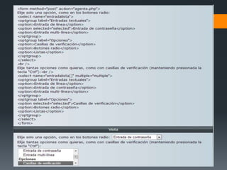 Los formularios en HTML permiten recolectar información de los visitantes e incluyen elementos como campos de texto, casillas de verificación, botones de opción, listas desplegables y botones. Los formularios pueden agrupar elementos relacionados y enviar la información a un script para su procesamiento.