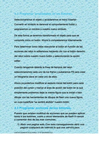 Este documento describe cómo crear y programar botones en Flash. Explica cómo crear un botón y asignarle diferentes estados como reposo, sobre y presionado. También cubre cómo programar acciones de botones como abrir una página web o controlar una película en curso mediante funciones como stop, play y más. Por último, explica cómo probar los botones una vez creados.