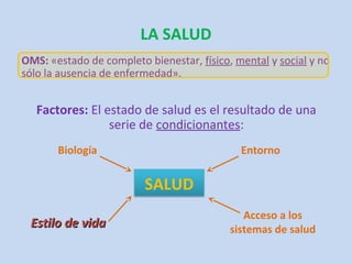 Este documento trata sobre varios temas relacionados con la salud, incluyendo la definición de salud de la OMS, factores que afectan la salud como el estilo de vida y el acceso a sistemas de salud, enfermedades infecciosas y no infecciosas, la inmunidad, la prevención y tratamiento de enfermedades, investigación médica, medicamentos genéricos, trasplantes, y la relación entre el desarrollo socioeconómico y la salud pública.