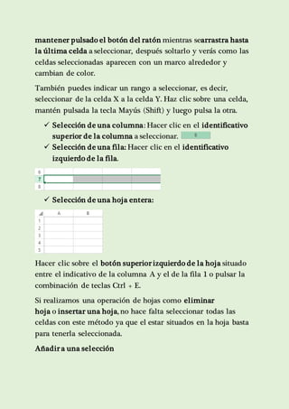 El documento describe varios métodos para seleccionar y manipular celdas en Excel, incluyendo seleccionar una celda individual, un rango de celdas, una columna, fila o hoja completa. También explica cómo copiar, mover y añadir celdas, filas y columnas mediante el uso del ratón y menús.