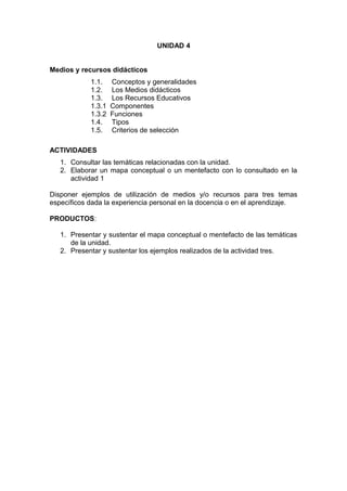 Este documento trata sobre los medios y recursos didácticos. Explica los conceptos de medios didácticos, recursos educativos y materiales didácticos. Describe los componentes de los recursos educativos como el docente, el alumno, el contexto y la estrategia. También cubre los tipos de recursos didácticos y los criterios para seleccionarlos, como que deben ser útiles, funcionales y apoyar pero no sustituir el aprendizaje.