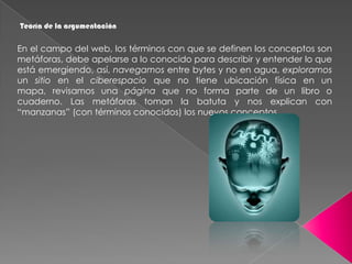 1) El documento discute la teoría de la argumentación y cómo se aplica al diseño de páginas web. 2) Explica que las páginas web pueden verse como formas de argumentación retórica donde la estructura, navegación y diseño buscan persuadir al usuario. 3) También propone que el análisis retórico puede usarse para evaluar el diseño de páginas web y establecer principios como que la estructura hipertextual y la navegación funcionan como argumentos.