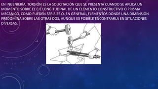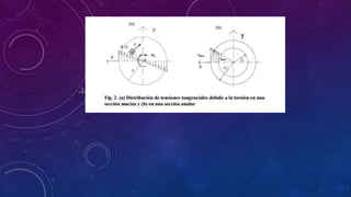 Este documento trata sobre elementos sometidos a torsión como vigas circulares, árboles de transmisión de potencia y barras circulares. Explica conceptos como ángulo de torsión, teoría de Coulomb para el cálculo de esfuerzos cortantes debido a la torsión, y deformación de elementos circulares sometidos a torsión. También cubre el cálculo de árboles de transmisión de potencia, esfuerzos en árboles, y torsión en barras circulares.