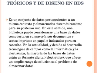 El documento habla sobre los fundamentos básicos teóricos y de diseño en bases de datos. Explica que una base de datos es un conjunto de datos almacenados sistemáticamente para su uso posterior y que actualmente la mayoría son digitales. También describe las funciones de un Sistema de Gestión de Base de Datos como cumplir reglas de integridad, copias de seguridad, control de accesos y representar relaciones entre datos. Finalmente, introduce a MySQL como un sistema de gestión de base de datos relacional multiusuario desarrollado como software libre.