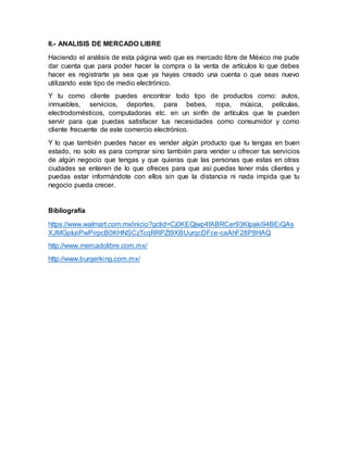 El informe analiza dos sitios web de comercio electrónico, Burger King y Walmart, y la plataforma de compra y venta Mercado Libre. Describe cómo estas páginas permiten a los clientes comprar productos de manera conveniente sin necesidad de visitar las tiendas físicas. También explica cómo Mercado Libre permite a las personas vender artículos u ofrecer servicios para expandir sus negocios. El informe concluye que el comercio electrónico brinda facilidad a los negocios para crecer alcanzando a client