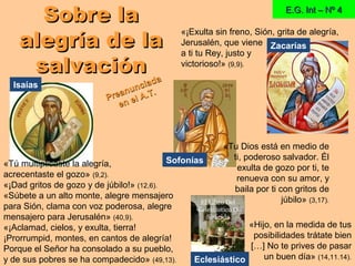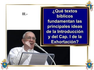 El documento cita varios pasajes bíblicos del Antiguo y Nuevo Testamento que fundamentan las ideas principales de la Introducción y el Capítulo I de la Exhortación apostólica Evangelii Gaudium sobre la alegría de la salvación, la alegría del Evangelio, y la urgencia de evangelizar. Se destaca que Jesús envió a los discípulos a predicar el Evangelio por todas partes y en todo tiempo, siguiendo su mandato misionero.