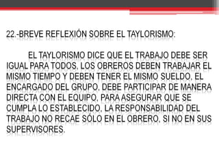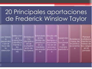El documento describe la teoría científica y clásica de la administración. Explica las condiciones históricas que llevaron al surgimiento de la teoría científica de la administración con la revolución industrial. Luego presenta una biografía de Frederick Winslow Taylor, pionero de la administración científica, y describe sus principales contribuciones como establecer científicamente el trabajo estándar. Finalmente, resume la respuesta de Taylor a los problemas de las empresas modernas.