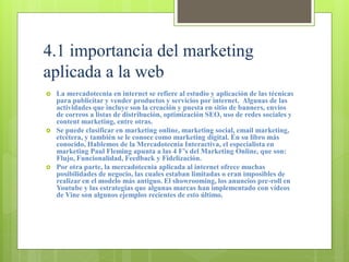 Este documento presenta información sobre conceptos clave de marketing digital y redes sociales. Explica brevemente las 4 P del marketing (producto, precio, plaza y promoción) y las 4 F del marketing en línea. También cubre temas como la administración de relaciones con clientes, el análisis de redes sociales y la importancia de los presupuestos de marketing. El objetivo general es proporcionar una introducción básica a estas áreas fundamentales del marketing digital y las redes sociales.