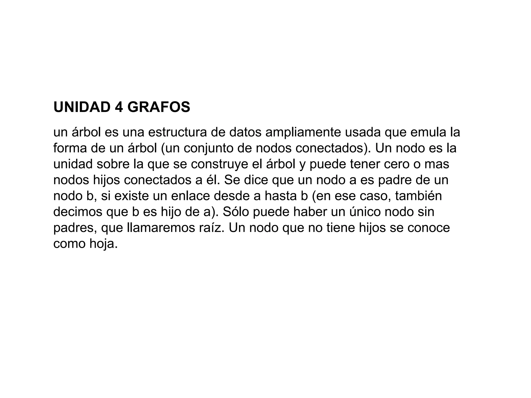 El documento describe diferentes tipos de estructuras de datos gráficas. Explica que un árbol es una estructura donde los nodos están conectados de forma jerárquica, con un nodo raíz y nodos hijos. También describe árboles binarios donde cada nodo tiene como máximo dos hijos. Luego, define un grafo como un conjunto de vértices y aristas que representan relaciones, y que se pueden utilizar para modelar rutas u otros problemas. Finalmente, explica que los grafos se representan en memoria mediante listas de adyacencia que