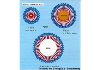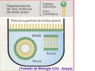 Este documento trata sobre los lípidos. Primero define los lípidos y clasifica sus funciones biológicas principales como estructurales, energéticas y vitamínicas/hormonales. Luego clasifica los lípidos según su estructura molecular en saponificables e insaponificables. Describe las características y funciones de los ácidos grasos, grasas, ceras, fosfolípidos y esfingolípidos saponificables, así como los terpenos, esteroides y prostaglandinas insaponificables. En resumen,