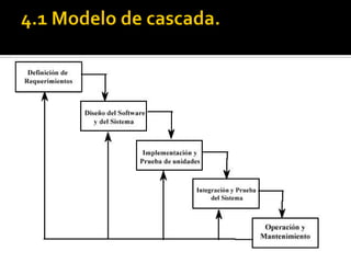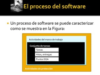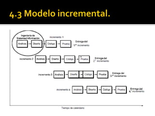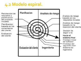 El documento describe diferentes modelos de procesos para el desarrollo de software, incluyendo el modelo en espiral, incremental, de ciclo de vida y Proceso Unificado. Explica que el Proceso Unificado es un enfoque iterativo e incremental basado en casos de uso que evoluciona la arquitectura y funcionalidad del sistema a través de iteraciones sucesivas.