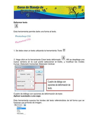 Este documento describe diferentes herramientas para modificar texto en Photoshop, incluyendo cómo rotar texto, deformar texto, aplicar suavizado a capas de texto, y darle volumen al texto. Explica cómo acceder a las opciones de carácter y párrafo, y los pasos para aplicar cada efecto de texto.
