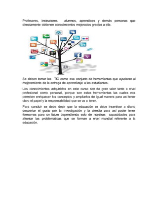 El documento destaca la importancia de las tecnologías de la información y la comunicación (TIC) en la educación, subrayando la necesidad de aprovechar las oportunidades que ofrecen para mejorar la calidad educativa en un contexto en constante cambio. Se enfatiza que todos los actores involucrados en el proceso educativo deben comprometerse con el uso efectivo de estas herramientas para enriquecer el aprendizaje. Además, se concluye que es crucial fomentar el interés por la investigación y el conocimiento científico para abordar problemas educativos globales.