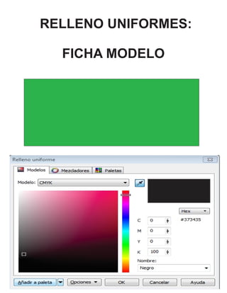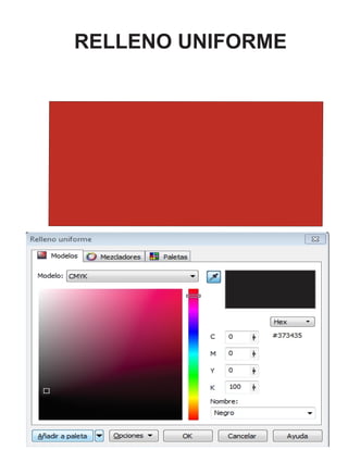 El documento describe diferentes tipos de rellenos uniformes y degradados que pueden aplicarse a objetos, incluyendo rellenos uniformes con una sola tonalidad de color, rellenos degradados lineales, cónicos y cuadrados con mezclas de colores, rellenos degradados de dos colores y rellenos de patrón personalizados con imágenes. También presenta una herramienta de editor de patrones para crear rellenos personalizados.