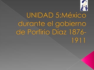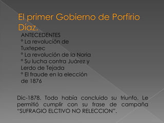 El documento resume la trayectoria política de Porfirio Díaz desde sus inicios en las revoluciones de Tuxtepec y la Noria, su lucha contra Juárez y Lerdo de Tejada, y su triunfo en 1878. Díaz impuso un régimen autoritario que promovió el orden y el progreso material, pero también llevó a la consolidación de una oligarquía y la represión de la oposición. Su gobierno se extendió hasta 1911 a pesar de haber prometido no reelegirse.