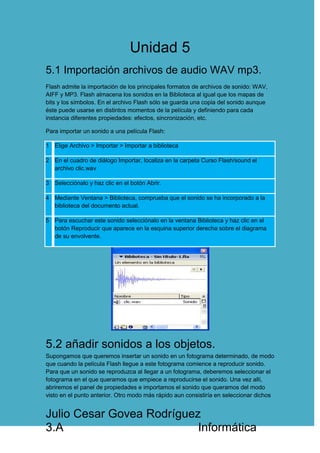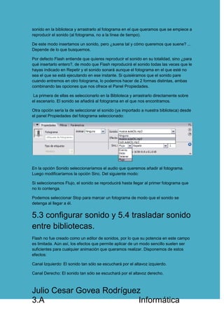 El documento describe cómo importar y configurar sonidos en Flash. Explica que Flash admite formatos de audio como WAV y MP3 y que los sonidos se almacenan en la biblioteca. Detalla los pasos para importar un sonido y reproducirlo, y cómo añadir sonidos a fotogramas arrastrándolos o usando el panel de propiedades. También cubre cómo configurar efectos de sonido como canales izquierdo/derecho y deshabilitarlos al cambiar de fotograma.