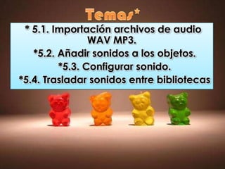 Este documento describe cómo manipular sonidos en Flash, incluyendo importar archivos de audio como WAV y MP3, añadir sonidos a objetos, configurar sonidos, y trasladar sonidos entre bibliotecas. Explica cómo insertar sonidos en fotogramas, aplicar efectos como aumento progresivo, y reproducir sonidos al pulsar CTRL + ENTER. También cubre cómo trasladar un sonido entre bibliotecas haciendo clic en Archivo → Importar → Importar a biblioteca.
