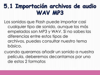 Este documento proporciona información sobre cómo importar y usar sonidos en películas creadas en Flash. Explica que los formatos de archivo de sonido más comunes son MP3 y WAV, y que se debe importar cualquier archivo de sonido externo para poder usarlo en una película de Flash. También describe diferentes efectos de sonido que Flash permite aplicar de forma sencilla, como desvanecimientos y ajustes de volumen.