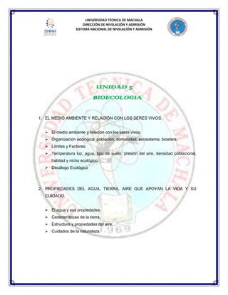 El documento habla sobre la bioecología y las relaciones entre los seres vivos y su medio ambiente. Explica conceptos clave como ecología, ecosistema, factores bióticos y abióticos, y las diferentes relaciones que pueden establecerse entre los organismos como la competencia, depredación, parasitismo, mutualismo e inquilinismo. También describe la organización ecológica desde los individuos hasta la biosfera.