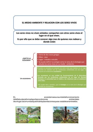 El documento habla sobre la bioecología y las relaciones entre los seres vivos y su medio ambiente. Explica conceptos como ecosistema, factores abióticos, población, comunidad, especie, y las diferentes relaciones que pueden establecerse entre organismos como competencia, depredación y parasitismo. Además, describe algunas adaptaciones de plantas y animales a factores ambientales como la temperatura.