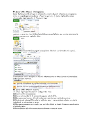 Este documento resume los diferentes métodos para seleccionar, copiar, mover y borrar celdas en Microsoft Excel 2010. Explica cómo seleccionar un rango de celdas, una fila o hoja completa, así como ampliar o reducir una selección. También cubre cómo copiar celdas utilizando el portapapeles o ratón, mover celdas entre hojas, y borrar contenido, formato o comentarios. Por último, introduce conceptos sobre datos como eliminar filas duplicadas, validación, ordenación y búsqueda de valores.