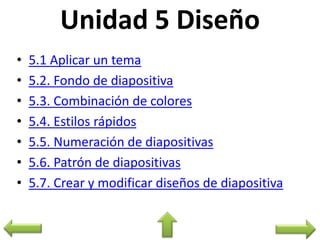 Este documento proporciona instrucciones sobre cómo aplicar temas, fondos y estilos de diapositivas en PowerPoint. Explica cómo crear una nueva presentación usando un tema predeterminado, personalizar el fondo y los colores de una diapositiva, agregar numeración de diapositivas y diseños predefinidos, e insertar nuevos diseños en un patrón de diapositivas.