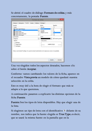 Excel permite cambiar el formato de las celdas mediante la modificación de la fuente, tamaño, estilo, color, alineación, bordes y rellenos. Se pueden aplicar formatos a celdas individuales o a rangos enteros utilizando cuadros de diálogo o botones en la cinta de opciones para cambiar rápidamente la apariencia. También se pueden aplicar temas preestablecidos o personalizados que estandarizan los formatos en toda la hoja de cálculo.