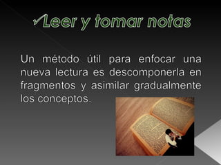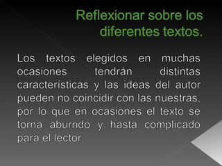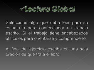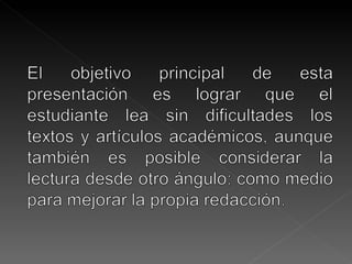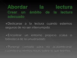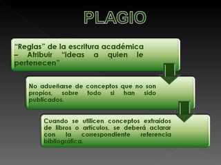 El documento ofrece recomendaciones sobre cómo seleccionar bibliografía y referenciar citas y fuentes de manera correcta en un trabajo. Indica que es necesario hacer fichas y notas para referenciar correctamente, y citar directamente la fuente o hacer una paráfrasis cuando se usen ideas de otro autor para evitar plagio. También menciona que la lectura es parte integral del proceso de escritura de un trabajo y que comentar las lecturas con otros ayuda a comprender mejor los textos.