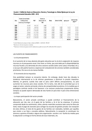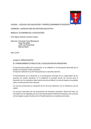 Este documento describe el financiamiento público de la educación en Argentina. Explica que la principal fuente de recursos son los impuestos recaudados a nivel nacional y provincial. Menciona que el 91,9% del presupuesto educativo se destina a salarios del personal docente y de maestranza, dejando poco para infraestructura y equipamiento. Finalmente, identifica desafíos como aumentar el presupuesto educativo hasta el 6% del PBI y rediseñar los salarios docentes.