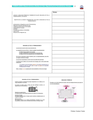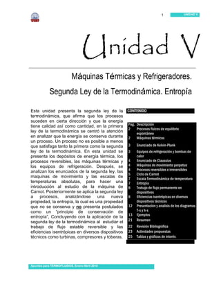 Este documento presenta la Unidad V sobre máquinas térmicas y refrigeradores. Incluye contenido sobre la segunda ley de la termodinámica, máquinas térmicas, enunciados de Kelvin-Plank y Claussius, procesos reversibles e irreversibles, ciclo de Carnot, escalas de temperatura, entropía, diagramas T-s y h-s, y aplicaciones de la segunda ley a procesos y dispositivos técnicos. También incluye notas, ejemplos, resumen, bibliografía y actividades prop