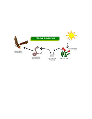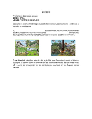 El documento trata sobre la ecología. Explica que la ecología estudia los seres vivos y su interacción con el medio ambiente y ecosistema. Define ecosistema como la unidad formada por las condiciones ambientales de un lugar, las comunidades de organismos que lo habitan y las relaciones entre ellos. También describe las relaciones entre los organismos como competencia, depredación, mutualismo y parasitismo, y cómo estas afectan las poblaciones.