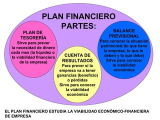 El documento explica las partes principales de un plan financiero para una empresa, incluyendo un plan de tesorería, cuenta de resultados y balance previsional. El plan de tesorería prevé los ingresos y gastos mensuales, la cuenta de resultados mide las ganancias y pérdidas, y el balance muestra la situación patrimonial de la empresa.