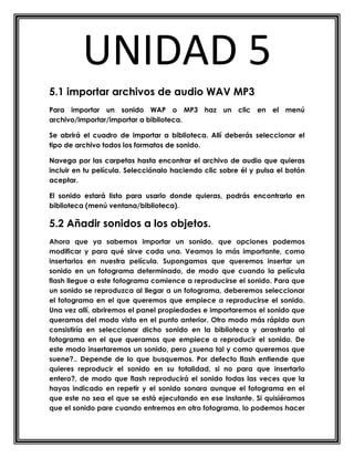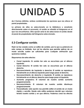 Este documento explica cómo importar archivos de audio en formato WAV o MP3 a una película de Flash, cómo añadir sonidos a fotogramas individuales arrastrándolos o usando el panel de propiedades, y cómo configurar efectos de sonido como variar el volumen o el canal izquierdo/derecho. También cubre cómo trasladar sonidos entre bibliotecas compartidas.