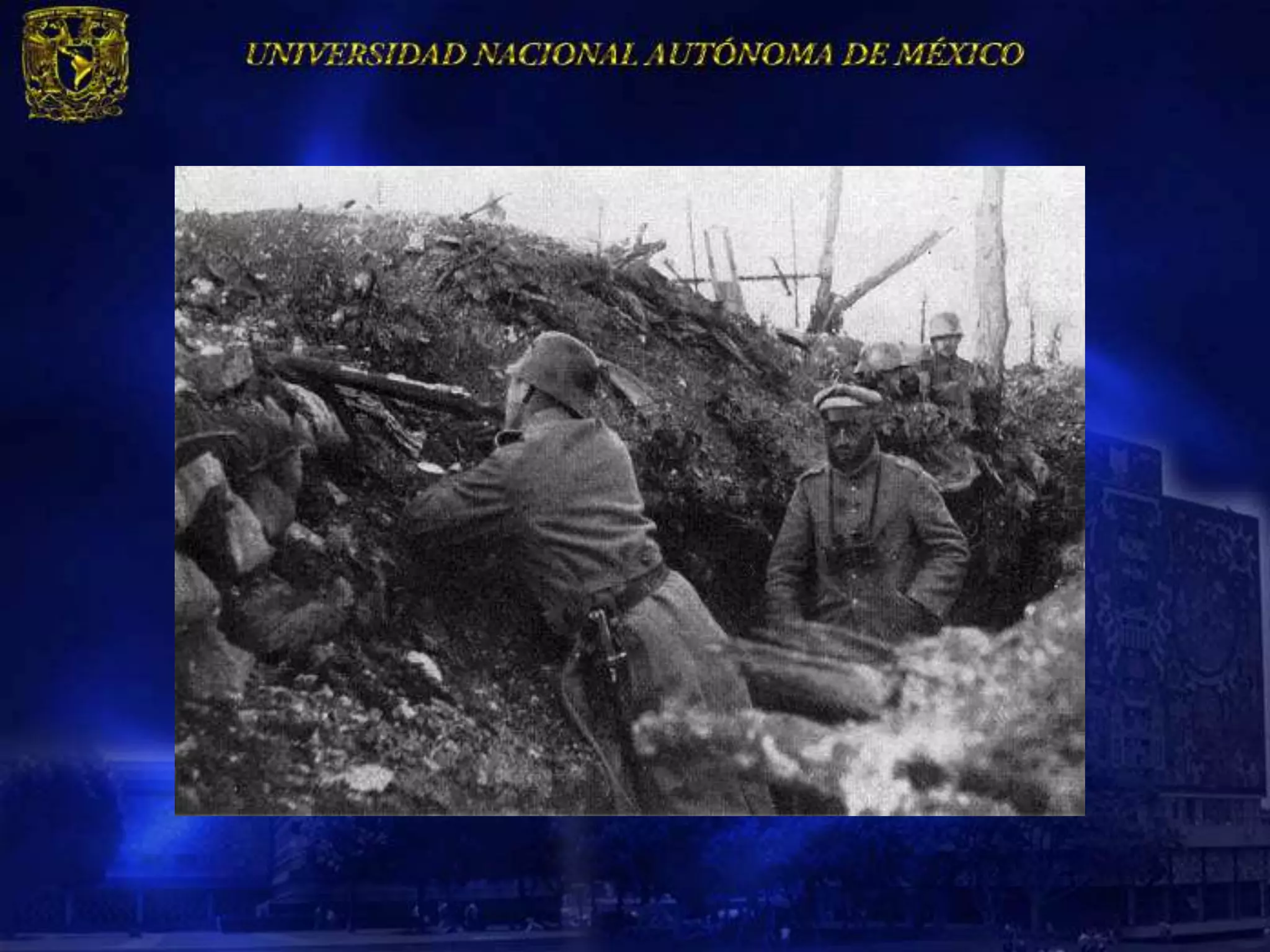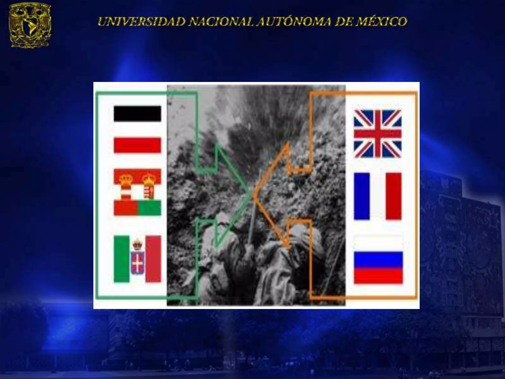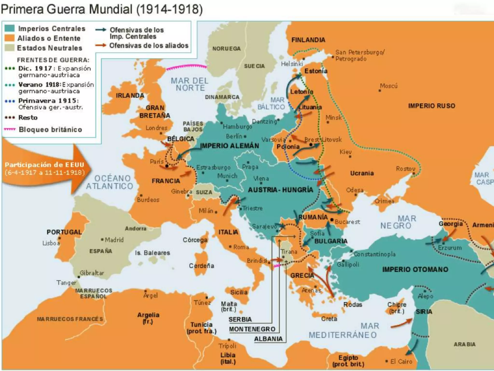 La Primera Guerra Mundial fue un conflicto mundial entre las Potencias Centrales de la Triple Alianza y los Aliados de la Triple Entente que duró desde 1914 a 1918. Comenzó con el asesinato del archiduque Francisco Fernando de Austria-Hungría y la subsiguiente declaración de guerra de Austria-Hungría a Serbia, lo que llevó a la entrada de las grandes potencias en el conflicto en los bandos opuestos. La guerra involucró tanto el frente occidental de trincheras en Francia y Bélgica como el frente oriental entre