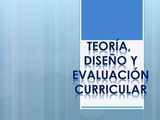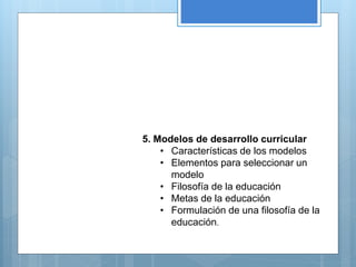 El documento presenta 5 perspectivas curriculares (tradicional, experimental, estructura de las disciplinas, conductista y constructivista) y discute sus enfoques. También presenta elementos para seleccionar un modelo curricular como la filosofía educativa y las metas de educación. Finalmente, enfatiza que las perspectivas curriculares proveen marcos para pensar sobre la enseñanza y el aprendizaje.