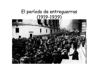 El documento resume el período entre las dos guerras mundiales (1918-1939), conocido como el Interbellum. Durante este período hubo una crisis de las democracias liberales, el ascenso de regímenes fascistas y autoritarios, y el auge de movimientos obreros inspirados en el socialismo y el comunismo, incluyendo el triunfo de los bolcheviques en Rusia liderados por Vladimir Lenin. Asimismo, el documento describe algunos eventos clave que ocurrieron en Europa e Iberoamérica durante este período