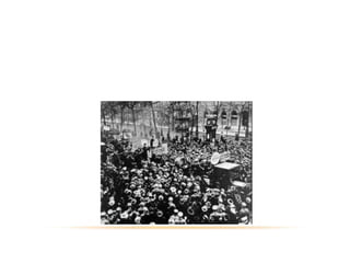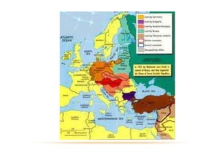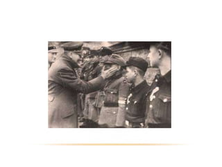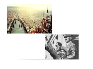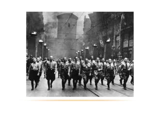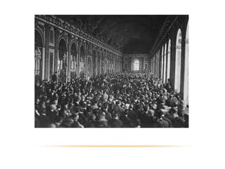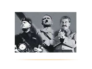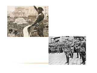 El documento resume el período entre las dos guerras mundiales (1918-1939), conocido como el período de entreguerras. Este período estuvo marcado por el surgimiento de regímenes autoritarios como el nazismo en Alemania y el fascismo en Italia y otros países europeos. También se caracterizó por el fracaso de la Sociedad de Naciones para prevenir la agresión de las potencias fascistas y el rearme de Alemania, lo que eventualmente condujo a la Segunda Guerra Mundial.